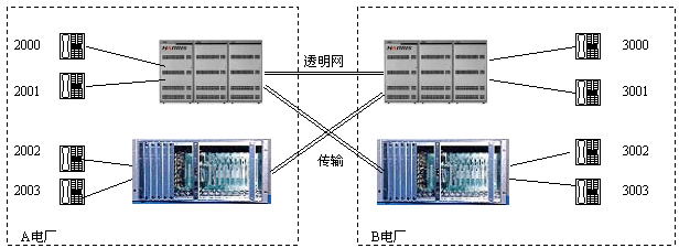 適用范圍:這種應用適用于對電話系統(tǒng)安全性要求嚴格的場合,如電力系統(tǒng)行政交換機與調度交換機就可以以上述方式實現(xiàn)備份,從而實現(xiàn)行政或調度交換機某一臺不能工作時,依然可以通過備份系統(tǒng)打電話。