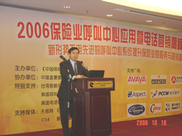 。。2006年10月18日,2006保險(xiǎn)業(yè)呼叫中心應(yīng)用暨電話營(yíng)銷(xiāo)高峰研討會(huì)在北京天鴻科園大酒店隆重召開(kāi),以下是大會(huì)開(kāi)幕致辭的相關(guān)圖片報(bào)道: