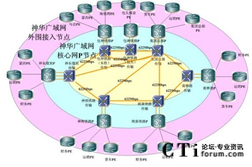 據(jù)神華集團信息管理部廣域網(wǎng)項目負責人說:“該項目建成后將是一個建設在高速傳輸網(wǎng)平臺之上,并利用其提供的線路構成廣域網(wǎng)核心節(jié)點之間的互聯(lián)線路,網(wǎng)絡拓撲在7個核心節(jié)點和以北京節(jié)點為中心直連7個核心節(jié)點的放射型622M環(huán)形+放射混合性企業(yè)頂級骨干廣域數(shù)據(jù)網(wǎng)絡結構。該網(wǎng)絡結構可避免任一段光纜中斷造成某節(jié)點直連線路和環(huán)線同時中斷的可能性,即對網(wǎng)絡單點故障實現(xiàn)環(huán)路保護。同時,網(wǎng)絡中斷到恢復的周期大大縮短:傳輸系統(tǒng)中SDH的環(huán)路自愈從中斷到恢復周期為50ms,網(wǎng)絡節(jié)點之間通過IGP的路由收斂,從中斷到恢復的周期約為200ms。”