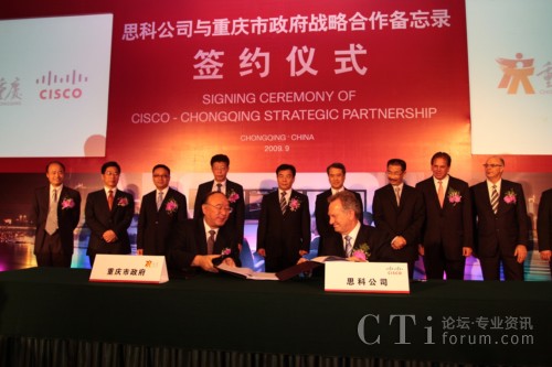 CTI論壇(ctiforum)9月14日消息:2009年9月11日,重慶市人民政府與思科正式簽訂合作備忘錄,雙方將結(jié)為戰(zhàn)略合作伙伴關系,就通信產(chǎn)品制造、“智能+互聯(lián)城市”試點示范、綠色技術研發(fā)與創(chuàng)新及風險投資等多方面展開深入合作。此次合作將進一步加快重慶市產(chǎn)業(yè)結(jié)構(gòu)和產(chǎn)品結(jié)構(gòu)調(diào)整,促進內(nèi)陸開放城市建設;加快發(fā)展重慶通信產(chǎn)品產(chǎn)業(yè)集群,把重慶建設成為西部重要的現(xiàn)代通信產(chǎn)品制造基地;推動以信息產(chǎn)業(yè)為主體的重慶高新技術產(chǎn)業(yè)發(fā)展以及本土創(chuàng)新和可持續(xù)性能力的提供,更高效便捷地加快本土企業(yè)的國際化進程;整合多方國際資源,以推進重慶在中國率先成為“智能+互聯(lián)城市”,讓市民享受更多的工作和生活便利及實惠。作為思科在華創(chuàng)新及可持續(xù)發(fā)展戰(zhàn)略實施的又一里程碑,此次合作不僅是思科“智能+互聯(lián)城市”計劃在中國與當?shù)卣氖锥群献黜椖,也是思科在“協(xié)作型創(chuàng)新模式”指導下激勵本土創(chuàng)新的全新實踐。
