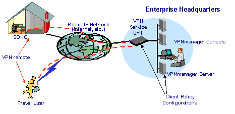 如上圖所示,企業(yè)網(wǎng)絡中心利用VPNManager建立全網(wǎng)的LDAP認證目錄服務系統(tǒng)或使用RADIUS認證系統(tǒng),當遠程用戶接入本地的ISP之后需要訪問企業(yè)網(wǎng)內(nèi)部的資源時,安裝在移動用戶計算機上VPNremote Client即登錄網(wǎng)絡中心的LDAP服務器或RADIUS服務器進行驗證工作,通過后即可訪問相應權限的資源。然后遠程主機通過Internet發(fā)送加密信息到企業(yè)網(wǎng)絡中心的VPN設備;當數(shù)據(jù)包到達目標VPN設備時,數(shù)據(jù)包被解封裝,數(shù)字簽名被核對無誤后數(shù)據(jù)包被解密。