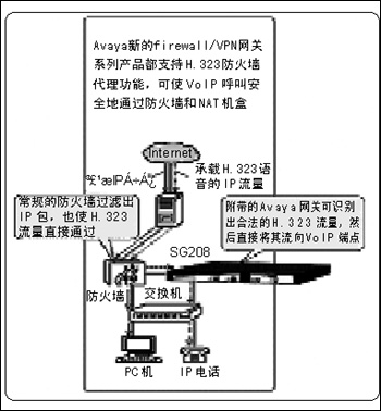 通常情況下,使用網(wǎng)絡(luò)地址解析(NAT)技術(shù),H.323流量都不能順利地通過防火墻或路由器設(shè)備。NAT利用掩碼將用戶的IP地址隱藏到了路由器中,用戶不得不向公共防火墻開放端口,以允許VoIP流量(如IP電話呼叫、微軟的網(wǎng)絡(luò)會議等)進入到企業(yè)內(nèi)部。而Avaya宣稱,這種新的H.323應(yīng)用代理能識別通過NAT設(shè)備的IP和H.323地址,自動打開和關(guān)閉防火墻端口(不需要管理),使IP呼叫流量能安全地通過,不會給網(wǎng)絡(luò)留下漏洞。