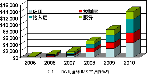 IMS作為一個通信架構(gòu),開創(chuàng)了全新的電信商業(yè)模式,拓展了整個信息產(chǎn)業(yè)的市場空間。IMS正在成為新一輪的投資熱點(diǎn)。IDC認(rèn)為,IMS市場將從目前的數(shù)百萬美元迅速增長到2010年的141億美元(如圖1)。對于電信行業(yè)來說,IMS的意義甚至超出了3G或4G,它將重新定義未來的通信業(yè)務(wù)。