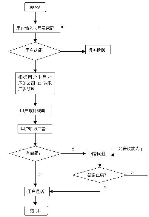 4)可設(shè)置廣告廠家的客戶服務(wù)中心電話,如電話用戶需要,可將其與該電話連通,同時在卡上計費,費率按本地到該通達地區(qū)計算。