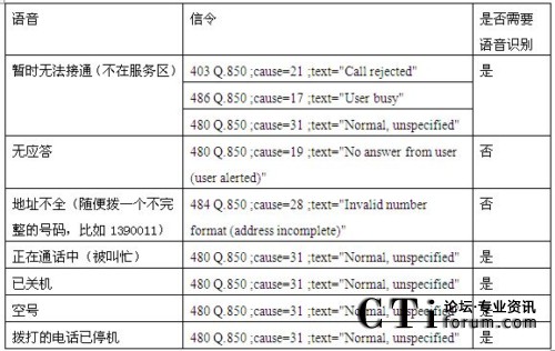 從歸納的情況看,只有無應答和地址不全兩種情況是可靠信令分析來識別的,其他的5種情況都無法通過信令檢測識別。特別是暫時無法接通的語言提示,播放完提示音有3種不同的信令,應該是屬于不同的情況,但是放了相同的語音。因此造成號碼識別錯誤的現(xiàn)象。