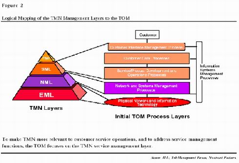 國際電聯(lián)的出發(fā)點雖好,但它更強調(diào)從網(wǎng)絡(luò)元素層開始的清晰的統(tǒng)一體系,而為了保護自己的商業(yè)秘密,各大運營商往往不希望公開自己的網(wǎng)絡(luò)元素層的標準,同時,網(wǎng)絡(luò)元素層的標準化對運營商的業(yè)務(wù)發(fā)展幫助不大。在熱烈討論了一段時間之后,TMN漸漸被忽視了。而另一只希望從技術(shù)角度解決管理問題的力量,電信管理論壇,卻帶有一定偶然性地逐漸確立了自己的地位。電信管理論壇在開始的時候并沒有夢想能建立覆蓋整個電信運營企業(yè)的管理系統(tǒng),其初衷是解決在當時日漸突出的跨企業(yè)的客戶數(shù)據(jù)交換問題。因此,和國際電聯(lián)不同,電信管理論壇從開始就非常強調(diào)實用性,并把目光集中到了各企業(yè)相互間有大量數(shù)據(jù)交換,因此迫切需要建立標準的服務(wù)管理層和網(wǎng)絡(luò)管理層,并提出了電信運營支持系統(tǒng)(OSS)的概念,并公布了模塊化的電信運營導(dǎo)圖(TOM)。