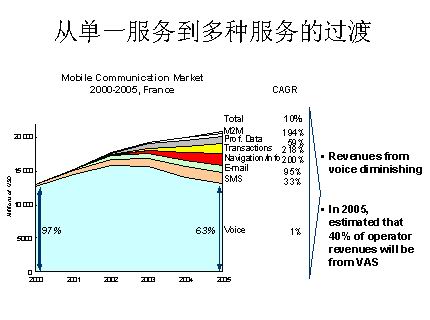 每一個細分市場從傳統(tǒng)的基礎(chǔ)服務(wù)逐漸向用戶的應(yīng)用需求靠攏,并以打包的方式向用戶提供解決方案服務(wù),造成增值電信業(yè)務(wù)的價值鏈越來越復(fù)雜。同時,用戶的需求主要體現(xiàn)在方便性和娛樂上,以移動增值業(yè)務(wù)為例,歐美的增值業(yè)務(wù)主要是被滿足用戶的方便性、實現(xiàn)實時通訊需求的即時短信等為主導(dǎo),而亞洲國家則普遍在以娛樂功能為主的SMS和移動游戲業(yè)務(wù)上潛力巨大。我們應(yīng)該看到,不管以哪種業(yè)務(wù)為主導(dǎo),市場的彈性都普遍增加,市場前景的不確定性增大。其中最顯著的特點為,市場需求不再是恒定的,市場的大小在很大程度上是由運營商的經(jīng)營決定的,與運營商的業(yè)務(wù)提供方式和促銷的效率密切相關(guān)。這無疑對運營商在新業(yè)務(wù)的市場預(yù)測、業(yè)務(wù)模式選擇和用戶需求的喚起上提出了更高的要求。