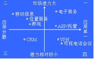 。〉谌笙蓿菏袌鰸摿Ρ容^小,應(yīng)用比較分散。由于經(jīng)營靈活,貼近客戶,小服務(wù)提供商在此會有非常大的優(yōu)勢。大型運營商如想經(jīng)營此象限內(nèi)的業(yè)務(wù),必須努力減小不同用戶需求的差異,并造成成本領(lǐng)先。如客戶關(guān)系管理(CRM)。