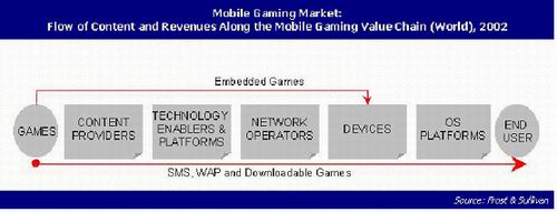 如果市場潛力足夠大,那么選擇適當?shù)臉I(yè)務(wù)模式就是實現(xiàn)市場潛力的保證。而業(yè)務(wù)模式的選擇是與業(yè)務(wù)的市場價值鏈分不開的。在一些市場價值鏈較復(fù)雜的應(yīng)用中,業(yè)務(wù)模式的選擇尤為重要,例如,下圖所示的移動游戲的價值鏈就是較復(fù)雜的一個: