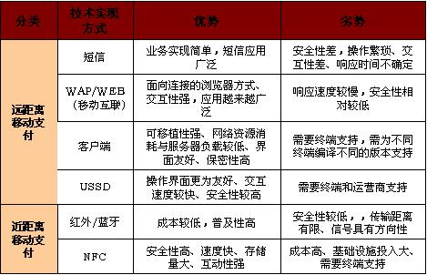 移動支付(Mobile payment)包括遠距離方式和近距離方式。遠距離移動支付的主要技術(shù)實現(xiàn)方式有SMS、WAP、客戶端(手機軟件)和USSD;近距離移動支付的主要技術(shù)實現(xiàn)方式有紅外和NFC。各種移動支付業(yè)務(wù)技術(shù)實現(xiàn)方式優(yōu)劣勢比較詳見圖表1。