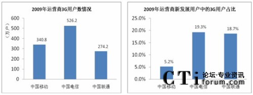 截止2009年12月底,三大運營商3G用戶數(shù)累計達到約1141萬戶,在移動通信用戶中的占比為1.5%。在三大運營商中,中國電信3G用戶數(shù)最大,達到526.2萬;中國電信和中國聯(lián)通的新發(fā)展用戶中3G用戶相對較高,均在19%左右;中國移動在3G用戶發(fā)展方面,暫時落后。