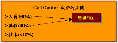 企業(yè)必須牢記在心,成功運(yùn)營呼叫中心的三要素 人員、流程和技術(shù),三項(xiàng)缺一不可,而更重要的是如何適當(dāng)?shù)卣线@三項(xiàng)要素。鑒于以往經(jīng)驗(yàn),呼叫中心的成功與否,人的因素占60%,流程因素占30%,而技術(shù)因素只占10%。這并不表示可以忽視技術(shù)的重要性,技術(shù)一樣很重要。如果沒有當(dāng)今日新月異的科技,企業(yè)便無法實(shí)現(xiàn)呼叫中心的運(yùn)營;而成功地實(shí)現(xiàn)呼叫中心有效的管理與運(yùn)營,關(guān)鍵在于管理能力,也就是對(duì)人員及流程的把握。