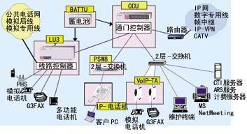 圖1顯示了一個(gè)IPstage系統(tǒng)的基本結(jié)構(gòu),IP PBX系統(tǒng)包含了通信控制器(CCU)、線路控制器(LU32)、以太網(wǎng)電話IP-TEL、連接普通電話的VoIP-TA適配器、后備電池,以及可直接連接PHS基站系統(tǒng)。通信控制器是IP