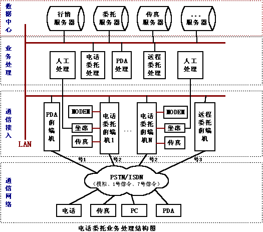 第一種方案是在證券營(yíng)業(yè)部加專用的前端機(jī)和處理機(jī),申請(qǐng)獨(dú)立的電話線路來處理PDA的委托,PDA和營(yíng)業(yè)部前端機(jī)采用雙向或單向的DTMF收發(fā)的方式完成通訊。根據(jù)市場(chǎng)的情況來看,這種方式不容易被證券營(yíng)業(yè)部和股民接受,證券營(yíng)業(yè)部要申請(qǐng)一定數(shù)量的電話線路,和證券電話委托的線路不能共用,增加了營(yíng)業(yè)部的費(fèi)用。由于線路的限制,股民在做委托查詢時(shí)往往出現(xiàn)線路阻塞等情況,另外DTMF通訊方式的有速度慢,信息容量有限,抗干擾性差等缺點(diǎn),股民不容易接受。目前東方潮公司的“東方獵人”的委托就是采用這種方式。