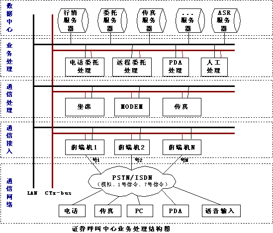 另一種方案是PDA和證券營(yíng)業(yè)部前端機(jī)(實(shí)際就是電話委托前端機(jī))采用FSK通訊方式,使用電話委托的通道來完成所有的委托查詢。這種方式的速度快,信息容量大,保密性強(qiáng),而且營(yíng)業(yè)部不需單獨(dú)申請(qǐng)電話線路,PDA和電話委托線路可動(dòng)態(tài)分配,使其電話線路得到最大限度的利用。另外,營(yíng)業(yè)部對(duì)外形象也好,只用一個(gè)號(hào)碼就可讓股民完成電話委托、PDA委托等多種委托方式,給股民帶來了方便。不過這種方式需要得到電話語音卡提供廠商的產(chǎn)品技術(shù)支持,語音卡必須同時(shí)支持標(biāo)準(zhǔn)的DTMF和FSK的方式,卡上有充足的能力來處理兩種方式,在語音處理卡的底層驅(qū)動(dòng)應(yīng)該將電話和PDA的委托區(qū)別開來,目前市場(chǎng)能夠完全支持這種應(yīng)用的只有深圳市東進(jìn)通訊技術(shù)股份有限公司的產(chǎn)品,東進(jìn)技術(shù)的新一代PCI系列語音卡數(shù)字卡和模擬卡都完全采用DSP(數(shù)字信號(hào)處理器)架構(gòu),卡上有專用DSP來處理DTMF和FSK的收發(fā),是目前PDA委托前端的最好選擇;這種方案還應(yīng)該得到證券電話委托系統(tǒng)的開發(fā)商的支持,在電話委托系統(tǒng)里增加處理PDA委托的功能。目前恒基偉業(yè)的“股靈通”就是采用這種方式。