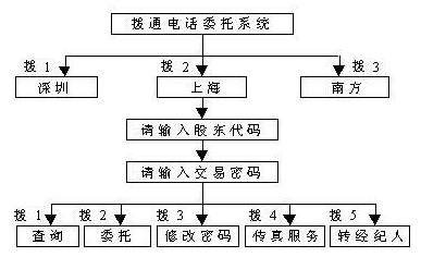 通過該項(xiàng)服務(wù),股民可以在任何地點(diǎn)使用任何一部雙音頻電話方便的向證券公司發(fā)出買入、賣出等各種委托指令,也可以發(fā)出查詢指令,證券公司的電話委托交易系統(tǒng)根據(jù)股民的指令自動完成委托及查詢操作,將結(jié)果反饋給股民。股民發(fā)給證券公司的信息,主要為數(shù)碼、數(shù)字,通過雙音頻電話按鍵來傳送。證券公司電話委托交易系統(tǒng)發(fā)給股民的信息,則是用語音傳送的操作及查詢結(jié)果。通過功能擴(kuò)充,還可提供其它配套服務(wù),如將查詢結(jié)果發(fā)送至股民的傳真機(jī)。若股民利用計(jì)算機(jī)接至委托公司,還可享受可視委托等更為多樣的服務(wù)。
