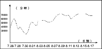 延吉通信從7月10日開始正式作宣傳,8月1日后每天時長均保持在55000分鐘以上。最新統(tǒng)計表明,自2002年7月至今,該業(yè)務(wù)已為延吉通信公司創(chuàng)造2500萬分鐘以上的市話增值。
