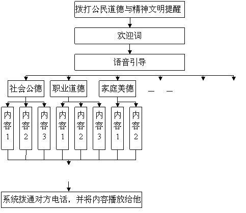 例如,某位公民對他(她)的鄰居或者同事一些不文明的行為(如深夜打麻將,亂倒垃圾,不講衛(wèi)生,破壞公物……)感到有必要進(jìn)行善意的提醒,但是,又覺得直接對他(她)說不合適,因?yàn)楫吘闺p方很熟悉或者還要共事,如果直接對對方進(jìn)行批評可能會引起對方的反感,即使對方認(rèn)為自己做的不對,也會感到很尷尬,很失面子,在這種情況下,這為公民可以撥打“社區(qū)道德與精神文明提醒熱線”,選取熱線內(nèi)預(yù)先已經(jīng)錄制好,經(jīng)過審定的錄音內(nèi)容,選取內(nèi)容后輸入對方的電話號碼,熱線系統(tǒng)就可以將這段錄音播放給對方聽,對方聽到之后就會意識到或者思考自己的行為里面有沒有不文明的行為,同時會相應(yīng)的約束自己的行為。但是在此過程中對方并不知道為他(她)點(diǎn)播這段錄音的人的電話號碼,從而也不知道是誰給她留的錄音。當(dāng)然,還可以通過電子郵件或者手機(jī)短消息的方式對他(她)進(jìn)行提醒。