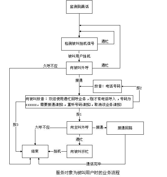 當(dāng)服務(wù)對象是被叫用戶時,產(chǎn)生遇忙漏話后,東進(jìn)漏話監(jiān)測設(shè)備(DMCS)實時檢測被叫用戶的掛機(jī)信號,如果被叫掛機(jī),則先向被叫外呼,呼出接通后,語音提示“歡迎使用遇忙回呼業(yè)務(wù),剛才有電話呼入,號碼為xxxxxx,需要接通請按1,重聽號碼請按2,取消該業(yè)務(wù)請按3”,如按1,系統(tǒng)向原主叫外呼(亦稱回呼),回呼成功(ACM)后,建立話音回路,進(jìn)一步接續(xù);如回呼原主叫時遇忙(SLB、STB等),則回呼失敗,向被叫用戶示忙。
