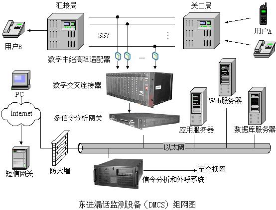 業(yè)務(wù)的組網(wǎng)分為信令網(wǎng)(SS7)和計算機(jī)網(wǎng)(TCP/IP),兩種異構(gòu)網(wǎng)絡(luò)通過東進(jìn)漏話監(jiān)測設(shè)備(DMCS)中的多信令分析網(wǎng)關(guān)連起來,多信令分析網(wǎng)關(guān)通過數(shù)字中繼高阻適配器和數(shù)字交叉連接器跨接在關(guān)口局和匯接局之間,同時也接到產(chǎn)生業(yè)務(wù)邏輯的計算機(jī)網(wǎng)。當(dāng)有外網(wǎng)的用戶A(也可以是本地網(wǎng)內(nèi)的用戶)呼叫網(wǎng)內(nèi)的注冊用戶B遇忙時,東進(jìn)漏話監(jiān)測設(shè)備(DMCS)中的多信令分析網(wǎng)關(guān)檢測到遇忙信號,就開始實時監(jiān)測信令網(wǎng)中用戶B的掛機(jī)信號,當(dāng)監(jiān)測到用戶B的掛機(jī)信號后,就將掛機(jī)信號轉(zhuǎn)換為基于TCP/IP協(xié)議的包信號,交給計算機(jī)網(wǎng)上的信令分析和外呼系統(tǒng)進(jìn)行信令分析,外呼系統(tǒng)根據(jù)信令,在業(yè)務(wù)邏輯的控制下,通過交換網(wǎng)外呼用戶A或B,完成業(yè)務(wù)動作。