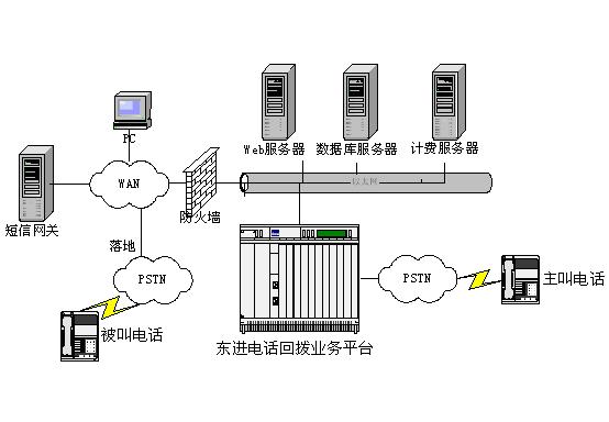 東進(jìn)電話回?fù)芟到y(tǒng)由東進(jìn)電話回?fù)芷脚_(tái)、數(shù)據(jù)庫(kù)服務(wù)器、Web服務(wù)器和計(jì)費(fèi)服務(wù)器組成。虛擬運(yùn)營(yíng)商在基礎(chǔ)運(yùn)營(yíng)商那租用模擬或數(shù)字中繼電話線路連接到東進(jìn)電話回?fù)芷脚_(tái),回?fù)苤鹘杏脩羰褂肞STN線路,撥被叫用戶使用寬帶IP寬帶網(wǎng)絡(luò),虛擬運(yùn)營(yíng)商需要尋找落地資源,通過互聯(lián)網(wǎng)可以很容易得到。