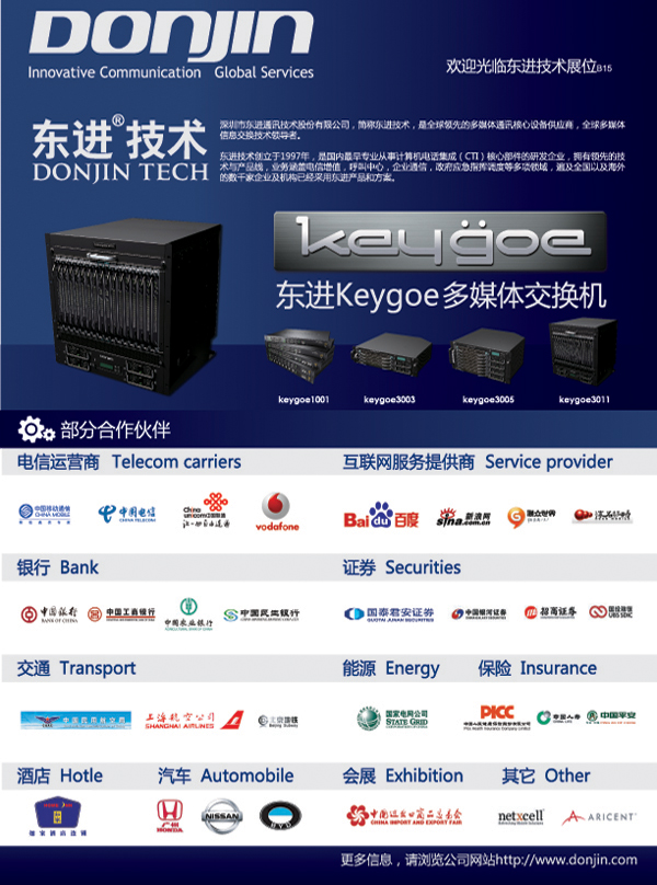 東進技術倡導開放、靈活的綜合信息通訊平臺,擁有領先的技術與產(chǎn)品線,業(yè)務涵蓋電信增值,呼叫中心,企業(yè)通信,政府應急指揮調度等多項領域,遍及全國以及海外的數(shù)千家企業(yè)及機構已經(jīng)采用東進產(chǎn)品和方案,同時,東進已經(jīng)具備隨時應對市場環(huán)境變化的發(fā)展優(yōu)勢,立足應用,根據(jù)客戶需求和市場發(fā)展方向,為用戶提供極具競爭力的多媒體通信產(chǎn)品,持續(xù)為客戶創(chuàng)造最大價值。