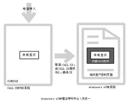 。。Ebanswers CRM整合呼叫中心的這種方式過程更清晰,當(dāng)有電話呼入系統(tǒng)時(shí),由內(nèi)嵌的OCX控件取到call