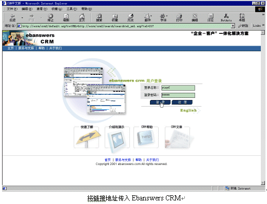Ebanswers CRM系統(tǒng)去激活相關(guān)客戶資料的IE頁面進(jìn)行處理:如果此號(hào)碼數(shù)據(jù)庫中存在,則顯示此人的信息,如果不存在,則顯示CRM中添加新線索的頁面。而Ebanswers