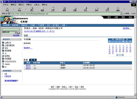 星際(杭州)網(wǎng)絡(luò)技術(shù)有限公司(www.ebanswers.com)研發(fā)的Ebanswers eCRM是中國(guó)第一套基于新一代網(wǎng)絡(luò)標(biāo)準(zhǔn)語言――XML的客戶關(guān)系管理系統(tǒng),整個(gè)系統(tǒng)提供了完善的企業(yè)級(jí)客戶關(guān)系全面解決方案,包含可無縫整合又可獨(dú)立運(yùn)行的三個(gè)功能組件:銷售,營(yíng)銷,服務(wù)流程自動(dòng)化軟件系統(tǒng);客戶溝通集成信息化方案;深層商業(yè)智能分析。