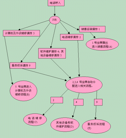 在交互式語(yǔ)音應(yīng)答系統(tǒng)IVR的幫助下,各服務(wù)流程有條不紊地進(jìn)行,每個(gè)職能部門(mén)管理自己部門(mén)的流程,提供全方位的客戶所要求的服務(wù)。下面我們以銷(xiāo)售咨詢?yōu)槔,看看這個(gè)簡(jiǎn)單的工作流程。