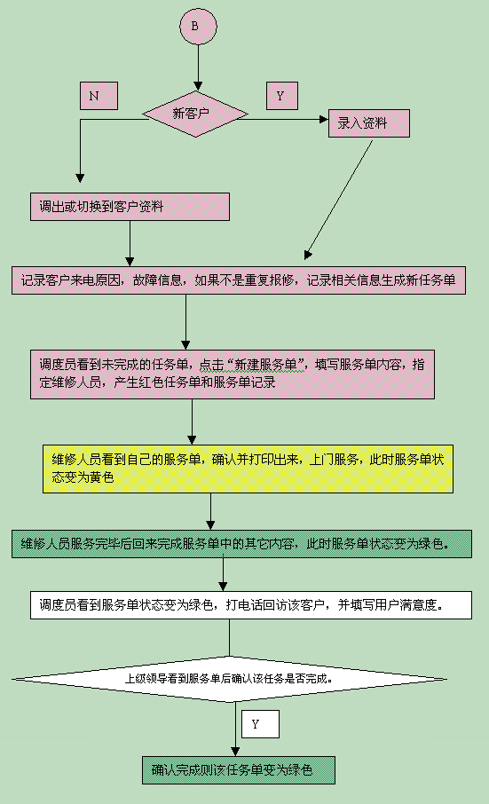 如果是需要上門(mén)維修的客戶,點(diǎn)擊"新建任務(wù)單",填寫(xiě)任務(wù)單上的相關(guān)內(nèi)容,此時(shí)任務(wù)單狀態(tài)為紅色;調(diào)度員看到新任務(wù)單,點(diǎn)擊"新建服務(wù)單",填寫(xiě)服務(wù)單內(nèi)容,指定維修人員。此時(shí)任務(wù)單狀態(tài)變?yōu)榧t色,服務(wù)單狀態(tài)則為紅色。維修人員看到自己的服務(wù)單,確認(rèn)并打印出來(lái),上門(mén)服務(wù),此時(shí)服務(wù)單狀態(tài)變?yōu)辄S色;維修人員服務(wù)完畢后回來(lái)完成服務(wù)單中的其它內(nèi)容,此時(shí)服務(wù)單狀態(tài)變?yōu)樗{(lán)色;調(diào)度員看到服務(wù)單狀態(tài)變?yōu)樗{(lán)色,打電話回訪該客戶,并填寫(xiě)用戶滿意度;上級(jí)領(lǐng)導(dǎo)看到服務(wù)單后確認(rèn)該任務(wù)是否完成。確認(rèn)完成則該任務(wù)單變?yōu)樗{(lán)色,否則再派出一張服務(wù)單。直到任務(wù)完成。