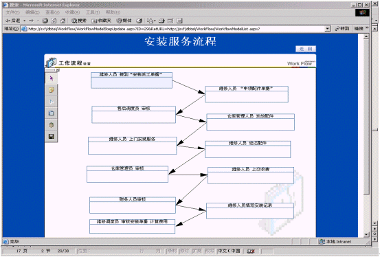 工作流程是指企業(yè)或公司的某種工作按照特定規(guī)范的流程在計(jì)算機(jī)上實(shí)現(xiàn)流轉(zhuǎn)的過(guò)程,工作流程由步驟、行為、行為處理、崗位的設(shè)置、權(quán)限設(shè)置等基本元素組成,主要對(duì)維修和回訪的流程進(jìn)行管理。
