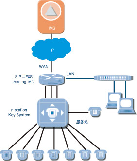 適用于支持模擬線的小交換機(jī),經(jīng)SIPIAD設(shè)備將模擬線路轉(zhuǎn)換為基于IP的SIP信令流和媒體流,接入IMS系統(tǒng)。經(jīng)愛(ài)立信測(cè)試認(rèn)證過(guò)的IAD產(chǎn)品有Mediatrix、Audiocodes、Linksys等。