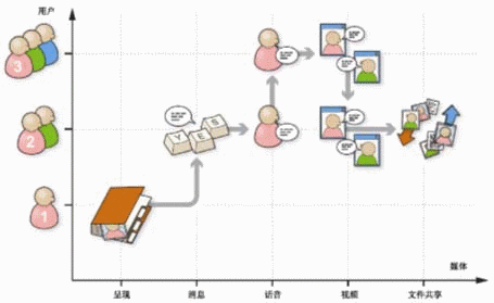 如圖1所示,用戶首先打開基于呈現(xiàn)業(yè)務(wù)的地址簿,向其好友發(fā)送一條消息,然后向該好友發(fā)起一個(gè)話音呼叫,在通話過程中又添加一個(gè)新的對象,隨后在這個(gè)多方通話中又添加了視頻業(yè)務(wù),接下來又去除一個(gè)對象,多方通話恢復(fù)為雙方通話,最后使用了文件共享業(yè)務(wù)。所有這些多媒體業(yè)務(wù)都是由用戶的一個(gè)SIP會(huì)話控制和激活的。