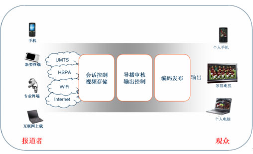 如今手機(jī)能拍照、攝像并不稀奇,攝像頭幾乎成了手機(jī)的標(biāo)準(zhǔn)配置,視頻通話也是3G特色業(yè)務(wù)之一,但要把手機(jī)拍攝的圖像實(shí)時(shí)回傳到電視臺(tái),并合理地發(fā)送到直播節(jié)目中卻還需要打通很多環(huán)節(jié)?偟膩碚f,電視臺(tái)需要的是一個(gè)業(yè)務(wù)控制平臺(tái),使后臺(tái)導(dǎo)播人員能監(jiān)控、審核手機(jī)回傳的多路視頻信號(hào),根據(jù)需要選取其中的合適內(nèi)容插入到直播節(jié)目中,同時(shí)系統(tǒng)還應(yīng)該能夠根據(jù)需求同時(shí)輸出各種格式的視頻,發(fā)布到電視頻道、互聯(lián)網(wǎng)或者手機(jī)電視中。