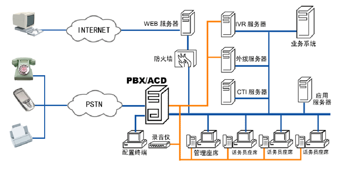客戶服務(wù)中心可以形象的理解為客戶關(guān)懷中心、客戶聯(lián)系中心、電話服務(wù)中心、客戶支持中心、服務(wù)熱線等。從技術(shù)的角度看,客戶服務(wù)中心是一組座席員集中進(jìn)行來(lái)電處理和發(fā)出呼叫與客戶聯(lián)系的專(zhuān)門(mén)的系統(tǒng)。呼叫中心系統(tǒng)結(jié)構(gòu)為: