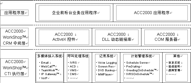 ACC2000 Workshop是聲訊科技集團(tuán)為基于Microsoft Windows操作系統(tǒng)的CRM應(yīng)用軟件開(kāi)發(fā)所建立的開(kāi)發(fā)平臺(tái)(中間件)。以ACC2000 Workshop為基礎(chǔ)的ACC2000集成多媒體溝通中心采用三層結(jié)構(gòu),利用ACC2000 Workshop的CRM中間層所提供的ActiveX控件、DLL動(dòng)態(tài)庫(kù)以及COM組件,就可以很容易地將溝通中心的各種功能融合到前端應(yīng)用程序中。ACC2000 Workshop的CTI執(zhí)行層接受中間件發(fā)來(lái)的請(qǐng)求,處理ACC2000的各項(xiàng)服務(wù)功能,并向CRM應(yīng)用程序返回執(zhí)行結(jié)果。見(jiàn)下圖。