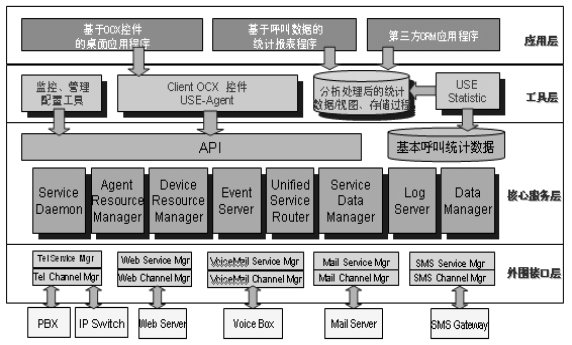 青牛USE從體系結(jié)構(gòu)上分為四個層次。第一層為外圍接口層,負(fù)責(zé)接入、抽象和發(fā)布來自不同渠道的服務(wù)請求;第二層是核心服務(wù)層,它是青牛USE軟件的核心部分,對來自不同渠道的服務(wù)請求和服務(wù)回復(fù)進(jìn)行統(tǒng)一的服務(wù)排隊管理、資源調(diào)度管理、日志數(shù)據(jù)管理等,屏蔽了不同渠道的物理特性,真正實現(xiàn)統(tǒng)一路由、統(tǒng)一管理;第三層是工具層,是青牛USE提供給應(yīng)用開發(fā)商和集成商的開發(fā)接口和配置工具;第四層,USE產(chǎn)品的應(yīng)用層,為呼叫中心應(yīng)提供應(yīng)用功能,比如:呼叫統(tǒng)計分析、呼叫監(jiān)控等。