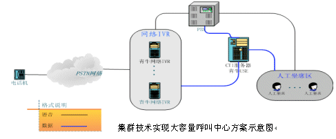 該方案利用青牛USE、網(wǎng)絡(luò)IVR等產(chǎn)品,通過青牛網(wǎng)絡(luò)IVR節(jié)點間的集群,實現(xiàn)了對呼叫中心的重新釋義,實現(xiàn)了呼叫中心的線性擴容,有效解決以下問題:
