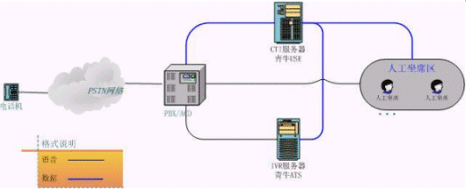 上圖是客服中心較常見的結(jié)構(gòu)圖,相當于將初級客服的CT-Server服務(wù)器一分為三。原來的語音板卡由現(xiàn)在真正的PBX替代,青牛USE和青牛ATS則是從CT-Server軟件包中獨立出來,強化各自的核心功能,運行在兩臺單獨的服務(wù)器上(IVR服務(wù)器還是需要語音板卡來處理話路,但語音板卡已經(jīng)不負責(zé)PBX的交換功能了)。這種類型的客服中心可以給客戶更大規(guī)模的、更穩(wěn)定的服務(wù),并且撥入電話的客戶感覺不到系統(tǒng)的變化。