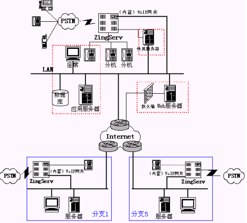 目前清華誠(chéng)志數(shù)碼公司分支機(jī)構(gòu)有5個(gè),可以通過(guò)ZingServ交換機(jī)的內(nèi)置VoIP功能在5個(gè)分支機(jī)構(gòu)實(shí)現(xiàn)組網(wǎng),從而大大節(jié)省長(zhǎng)話費(fèi)用,并實(shí)現(xiàn)內(nèi)部分機(jī)號(hào)統(tǒng)一編碼:
