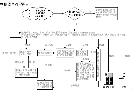 - 本系統(tǒng)的服務內(nèi)容包括:企業(yè)與政府部門簡介,產(chǎn)品與服務簡介,人工服務,轉(zhuǎn)部門分機,呼叫轉(zhuǎn)移,部門直線電話號碼查詢,質(zhì)量與服務投訴,錄音留言等。