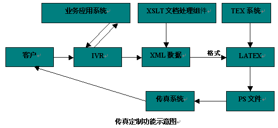 用戶通過IVR與業(yè)務(wù)應(yīng)用系統(tǒng)交互,獲得所需的傳真數(shù)據(jù),這些傳真數(shù)據(jù)在系統(tǒng)中以XML數(shù)據(jù)的格式存在,系統(tǒng)然后調(diào)用XSLT(英文縮寫,XSLT是語言,專門處理XML數(shù)據(jù),通過一段XSLT程序可以將XML數(shù)據(jù)轉(zhuǎn)換成其他的形式的文檔,如HTML,LATEX文檔,從而用來顯示XML數(shù)據(jù)給人們閱讀)文檔處理組件對XML數(shù)據(jù)處理,處理結(jié)果是LATEX(LATEX是TEX系統(tǒng)增加了一些宏指令的增強,TEX系統(tǒng)是一個計算機排版系統(tǒng),