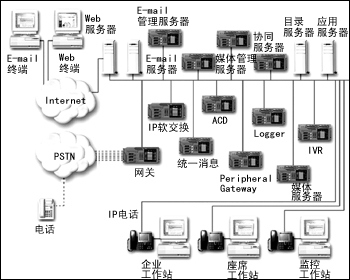 從上面的圖1、圖2中,可以看到IP通信大大簡化了企業(yè)的網(wǎng)絡(luò)通信結(jié)構(gòu)。但是為了實(shí)現(xiàn)不同的功能和應(yīng)用,網(wǎng)絡(luò)中仍然存在很多的服務(wù)器,各個(gè)品牌不同功能的服務(wù)器之間的協(xié)同成為最顯著的問題,同時(shí)維護(hù)和運(yùn)行這樣大量的設(shè)備也需要大量的資源支持。而且,這僅是單點(diǎn)的客戶服務(wù)中心所需的配備,而在基于IP通信的分布式客戶服務(wù)中心的構(gòu)建中,所涉及的設(shè)備更多。
