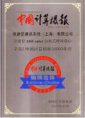 奧迪堅(jiān)基于IP分布式呼叫中心平臺(tái)榮獲中國(guó)計(jì)算機(jī)報(bào)2003年度編輯推薦獎(jiǎng)!吨袊(guó)計(jì)算機(jī)報(bào)》(CIW-China