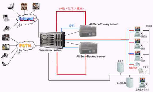 奧迪堅通訊系統(tǒng)有限公司作為CTI通訊平臺的提供商,在技術(shù)上不斷創(chuàng)新,對產(chǎn)品精益求精,尤其體現(xiàn)在對系統(tǒng)的運行安全性的要求上,為了防止電信接入設(shè)備或者企業(yè)網(wǎng)絡(luò)出現(xiàn)故障而造成的呼叫中心服務(wù)中斷,奧迪堅呼叫中心系統(tǒng)提供安全保護(hù)冗余切換系統(tǒng),來保障呼叫中心在意外情況下的正常工作,該安全冗余切換系統(tǒng)通過對電源、T1/E1、模擬trunk、分機(jī)座席、以及各種網(wǎng)絡(luò)鏈路串口等備份切換來實現(xiàn)可靠的運行。除此之外,奧迪堅系統(tǒng)本身也提供強大的安全保障,由于采用先進(jìn)IP內(nèi)核一體化設(shè)計,集傳統(tǒng)PBX、CTI服務(wù)器、IVR、ACD、Recording、FAX等眾多設(shè)備于一體,這樣有效的避免了因為外掛設(shè)備過多以及設(shè)備供應(yīng)商的不同而存在的兼容性的問題,從而降低了給呼叫中心系統(tǒng)帶來的的不穩(wěn)定的安全隱患。在系統(tǒng)之外依靠安全保護(hù)冗余切換系統(tǒng),可以實現(xiàn)外線、分機(jī)、以及各種鏈路接口的雙倍安全運行。如上圖所示:兩臺奧迪堅的呼叫中心服務(wù)器和奧迪堅安全冗余切換系統(tǒng)構(gòu)成呼叫中心熱備份系統(tǒng),在兩臺服務(wù)器中安裝所有的呼叫中心功能模塊。通常情況下由主呼叫中心服務(wù)器提供系統(tǒng)的正常運行,備份服務(wù)器通過安全保護(hù)冗余切換系統(tǒng)的服務(wù)監(jiān)測模塊來監(jiān)測主服務(wù)器的各項設(shè)備和鏈路的使用情況,當(dāng)主服務(wù)器遭遇突發(fā)故障不能繼續(xù)工作時,系統(tǒng)馬上實施自動切換,就會通過安全保護(hù)冗余切換系統(tǒng)將系統(tǒng)切換到備份的呼叫中心系統(tǒng)上來,此鏈路可以是數(shù)據(jù)、語音、網(wǎng)絡(luò)、串口等。當(dāng)安全保護(hù)冗余切換系統(tǒng)自身出現(xiàn)斷電或者其他故障時,所有鏈路均保持正常工作狀態(tài)。
