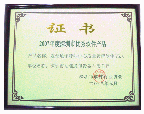 2008年3月14日,深圳市友鄰?fù)ㄓ嵲O(shè)備有限公司(以下簡稱“友鄰?fù)ㄓ崱保┬迹局鞔蜍浖a(chǎn)品“友鄰?fù)ㄓ嵑艚兄行馁|(zhì)量管理軟件V5.0”(即 AP Suite 呼叫中心質(zhì)量管理系統(tǒng)V5.0)榮獲深圳市軟件行業(yè)協(xié)會(huì)“2007年度深圳市優(yōu)秀軟件產(chǎn)品”榮譽(yù)稱號。