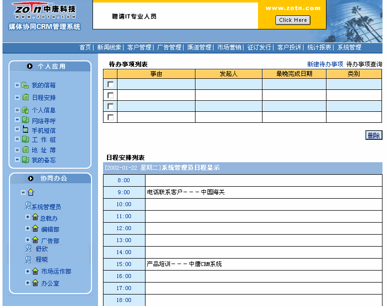協(xié)同CRM實現(xiàn)單位內(nèi)部各個部門、各地分支機構(gòu)、代理商以客戶為中心協(xié)同工作,具體功能包括對新聞線索的管理,對廣告的管理,對征訂發(fā)行的管理,客戶反饋的管理,客戶信息分析決策,競爭對手管理、檢索統(tǒng)計輸出、系統(tǒng)維護等模塊。