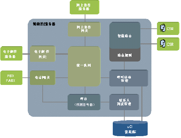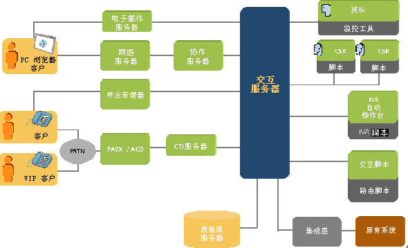 交互(輔助)服務器是客戶服務系統(tǒng)體系結構的主要組件,控制所有的客戶交互以及它們在座席代表間的分配。其主要功能是: