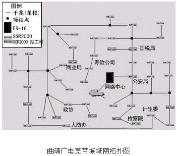 網(wǎng)絡(luò)建設(shè)的第一期工程結(jié)束后,本地多媒體寬帶骨干網(wǎng)以曲靖市政府內(nèi)的機(jī)房作為中心機(jī)房。核心機(jī)房采用支持千兆以太網(wǎng)、SDH及ATM接口的高檔交換式路由器ER-16。主干光纖沿市區(qū)鋪設(shè)成為一個(gè)星形鏈路,以便在不久的將來(lái)能夠?qū)⒂?jì)生委和人防辦的光纖連接起來(lái)形成一個(gè)環(huán)狀鏈路。市區(qū)內(nèi)共設(shè)43個(gè)光節(jié)點(diǎn),各鄉(xiāng)鎮(zhèn)有一個(gè)光節(jié)點(diǎn),以92條單模光纖直接連入核心機(jī)房的交換式路由器,由此與核心機(jī)房形成一個(gè)星狀拓?fù)浣Y(jié)構(gòu)。
